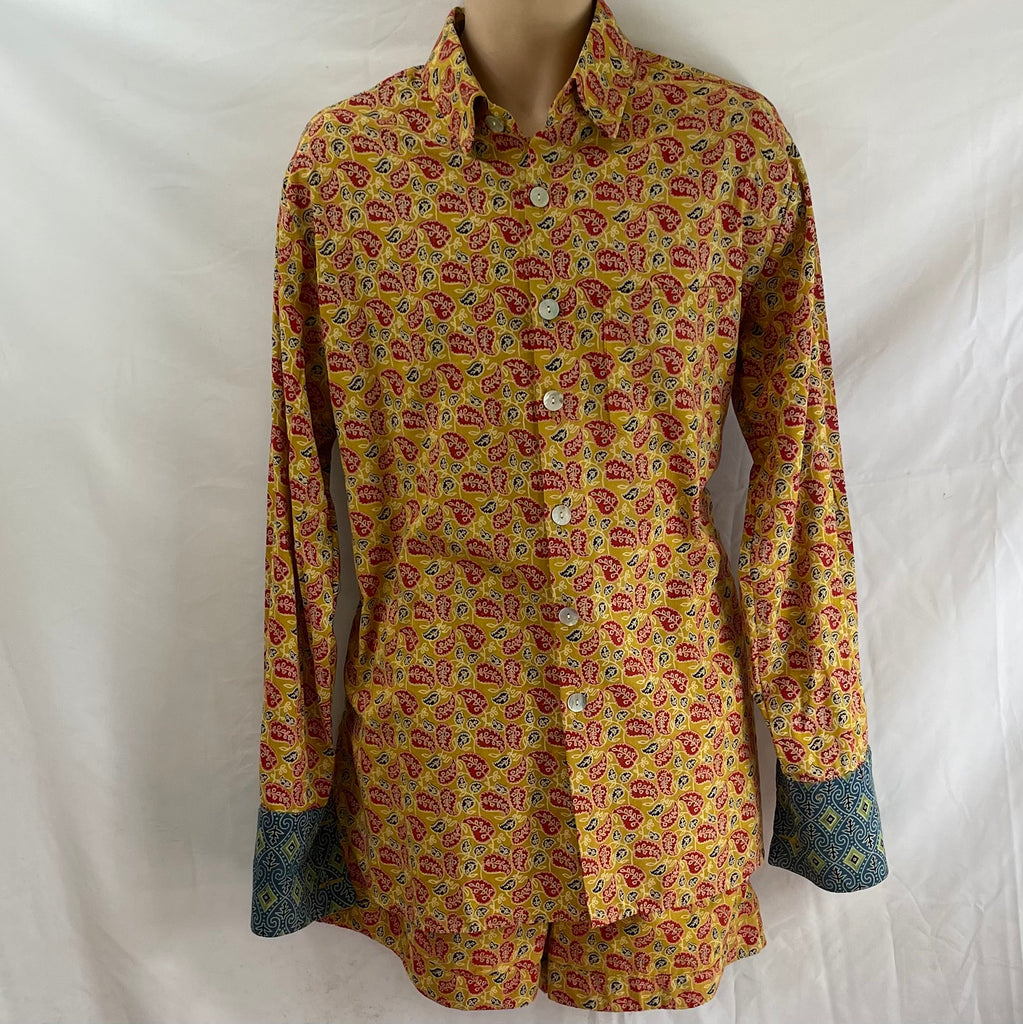 Hand block printed light cotton shirt with tails and double cuffs, and mother of pearl buttons and cuff links