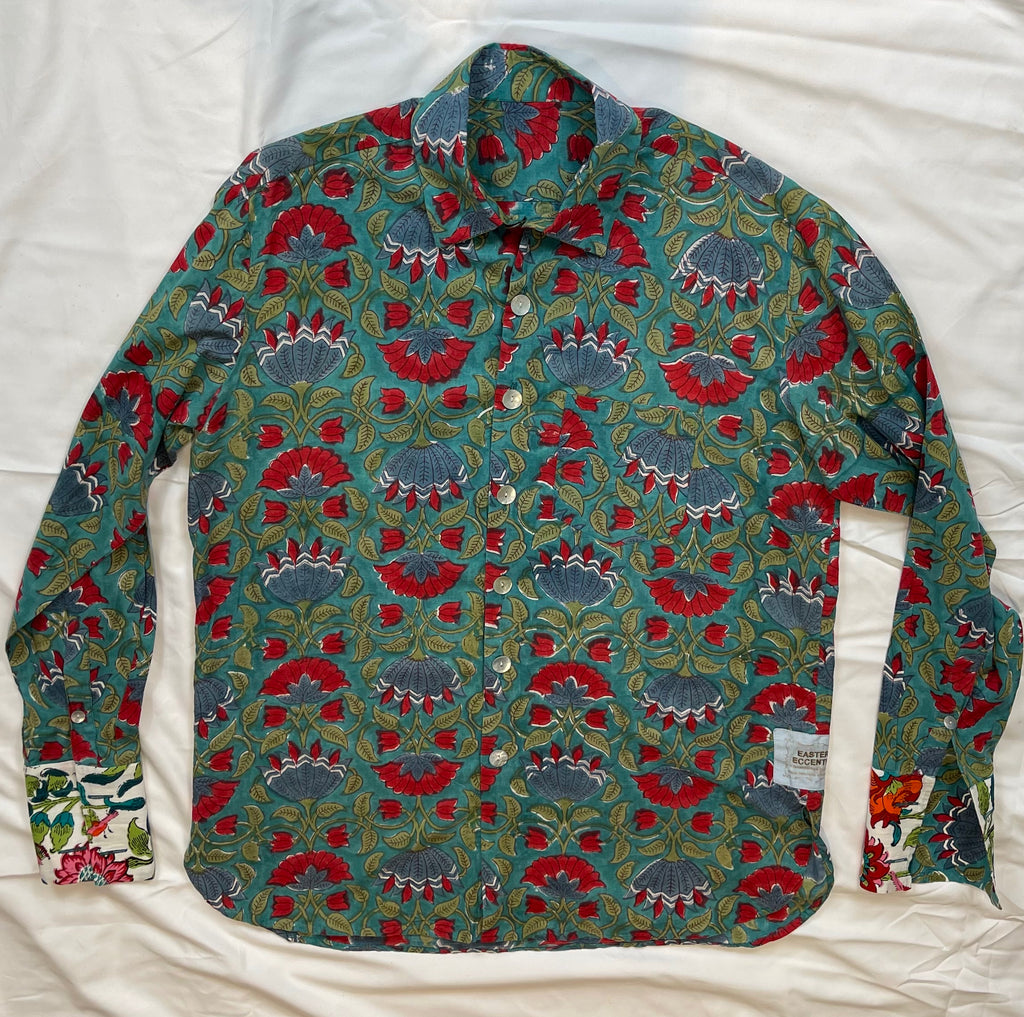Hand block printed light cotton shirt with tails and double cuffs, and mother of pearl buttons and cuff links